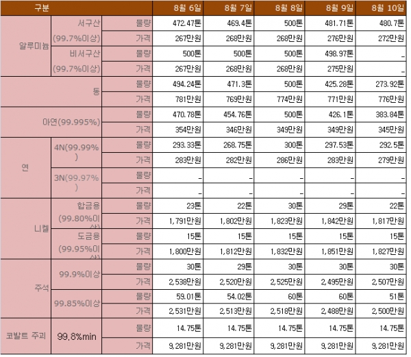 8월 10일 조달청 비철금속 비축물자 방출가격