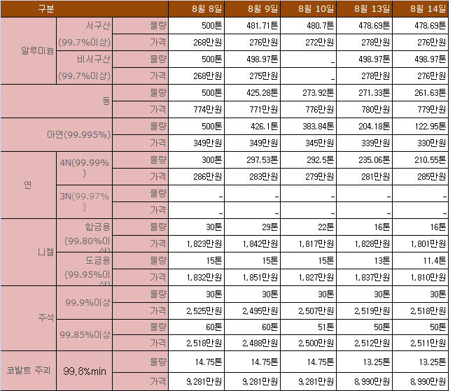 8월 14일 조달청 비철금속 비축물자 방출가격