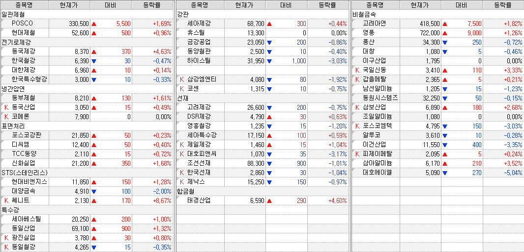 철강ㆍ비철금속 업체 주가 동향 (28일 종가 기준)