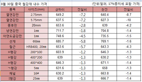 천진에서는 열연강판 2.75mm와 5.75mm이 8.7달러, 10달러씩 하락했으며, 중후판이 4.2달러, 냉연강판이 1.4달러 하락했다. 아연도금강판은 1.5달러, 선재는 1.6달러, 철근은 4.3달러 하락했다. H형강 200mm*100mm, 400mm*200mm, 400mm*400mm은 각각 1.3달러, 1.3달러, 1.4달러씩 하락했으며, ㄱ형강과 채널, I형강과 채널은 각각 1.3달러, 1.4달러, 1.4달러씩 하락했다.
