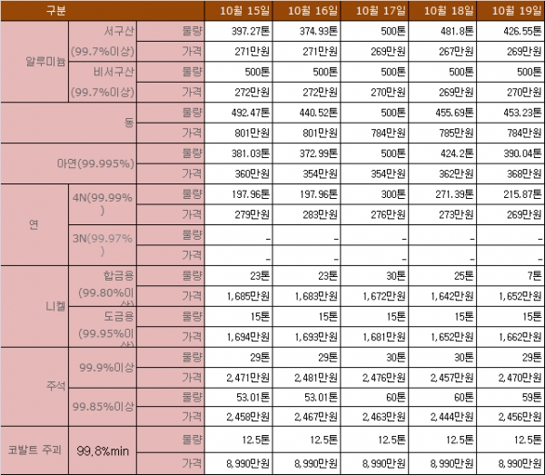 10월 19일 조달청 비철금속 비축물자 방출가격