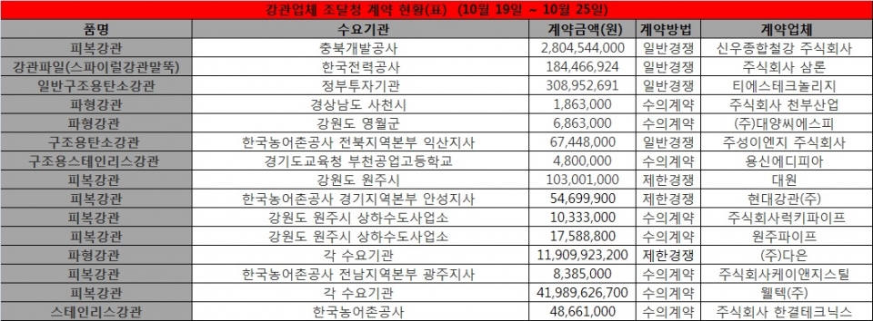강관업체 조달청 계약 현황(표) (10월 19일 ~ 10월 25일)