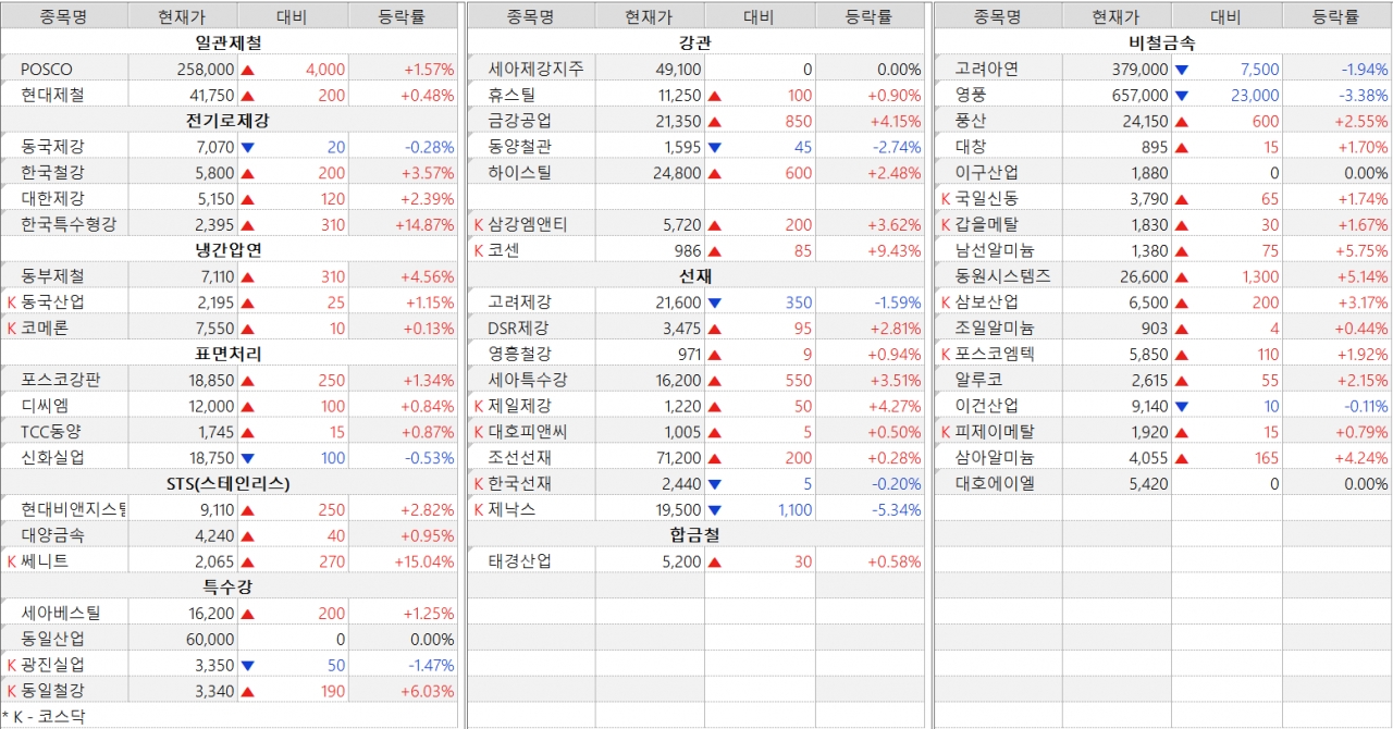 철강ㆍ비철금속 업체 주가 동향 (31일 종가 기준)