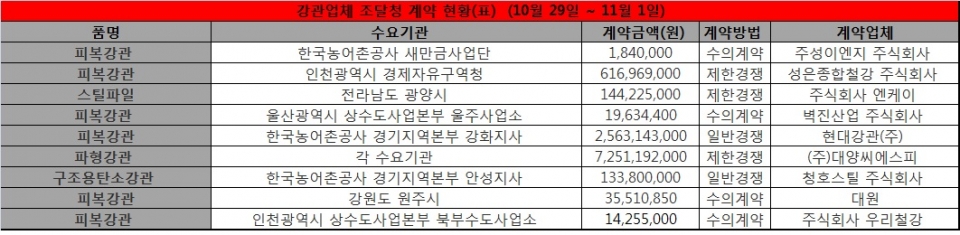 강관업체 조달청 계약 현황(표) (10월 29일 ~ 11월 1일)