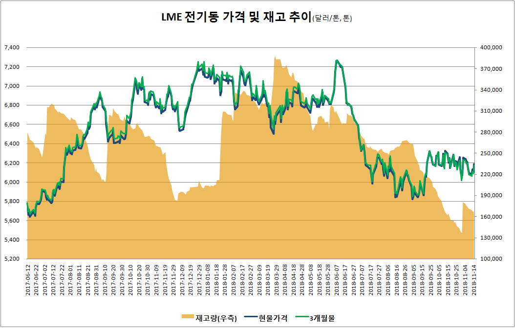 한편, 칠레 동광산 기업인 안토파가스타(Antofagasta)사와 중국 장시동업(Jiangxi Copper)사가 2019년 동 제련수수료(TC)를 6년내 최저 수준으로 합의한 것으로 알려졌다. TC는 일반적으로 동광산 생산이 부족한 상황에서 하락하기 때문에 내년 동정광 공급이 더욱 부족할 것으로 예상할 수 있는 배경이 되고 있다.