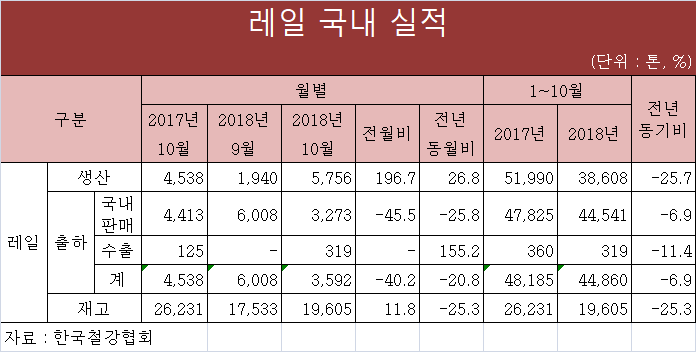 이와 관련해 올해 레일 실적은 전년과 비교해 부진한 것으로 집계됐다. 10월 생산의 경우 5,756톤을 기록해 전월 대비 196.7%, 전년 동월 대비 26.8% 반짝 증가했으나, 10월까지 누계 생산은 3만8,608톤으로 지난해 같은 기간 대비 25.7% 줄어든 것으로 집계됐다.