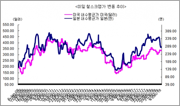 한편 터키의 미국 철스크랩 수입 가격은 HMS No.1&2(80 : 20) 기준 톤당 300달러(CFR) 수준을 유지하고 있다.