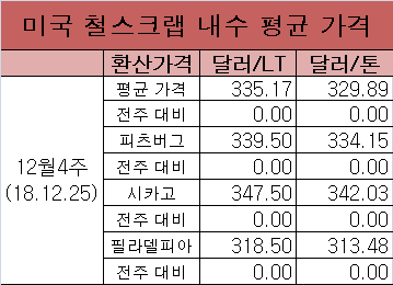 최근 외신에 따르면 12월 25일 기준 HMS No.1 내수 평균 가격은 전주 대비 보합인 톤당 329.89달러(톤)를 기록했다.