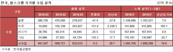 한국철강협회가 최근 발표한 수출입 통계자료에 따르면 한국의 올해 1~3월 철스크랩 수입은 190만8,288톤으로 전년 동기 대비 19.6% 증가했다.