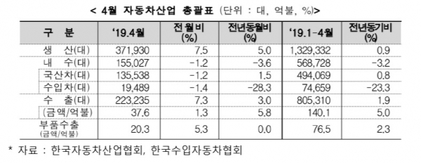 현대차는 팰리세이드 등 신차 3종을 출시하면서 생산이 8% 증가했고 2종의 신차를 선보인 쌍용자동차도 29.3% 생산이 늘었다. 기아차도 신형 쏘울, 니로 등의 수출 호조로 생산이 3.8% 늘어났다. 반면 르노삼성은 부분파업 등의 영향으로 32.9% 감소했다.