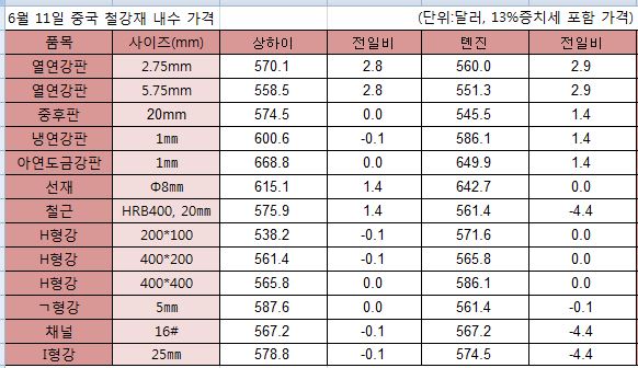 천진에서는 열연강판 2.75mm, 5.75mm는 모두 2.9달러씩 상승했으며, 중후판과 냉연강판, 아연도금강판은 모두 1.4달러씩 상승했다. 선재와 H형강 200mm*100mm, 400mm*200mm, 400mm*400mm는 모두 변동이 없었다. 반면 ㄱ형강은 0.1달러, 철근과 채널, I형강은 모두 4.4달러씩 하락했다.
