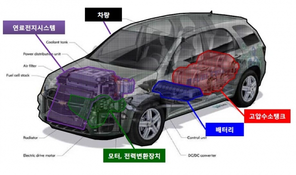 수소전기차는 스택(stack)과 운전장치, 전장장치, 수소저장장치가 핵심부품으로 꼽히는데, 운전장치와 전장장치는 기존 배터리 전기차와 거의 유사한 반면에 스택과 수소저장장치는 새로운 부품시장으로 커질 전망이다.