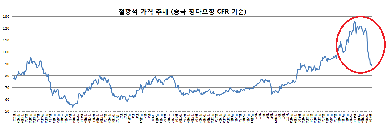 철광석 가격은 7월말가지 최근 5년來 최고 수준의 가격이 이어지면서 강세를 보여왔으나 8월 들어 급락세를 나타내며 90달러선이 무너졌다. 지난 4월 초 이후 최저 가격으로 떨어졌다.