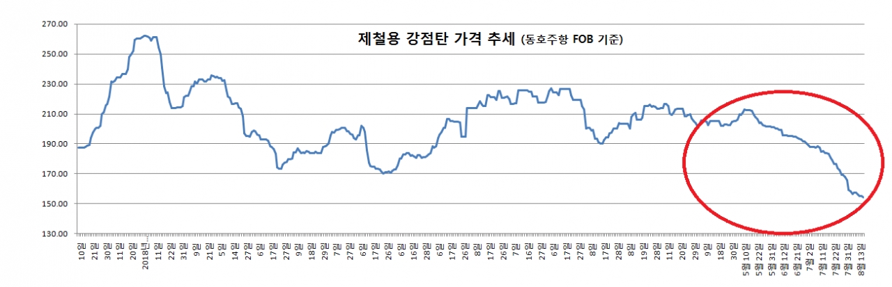 원료탄 가격은 중국 정부의 수입규제 등의 영향으로 가격이 지속적인 하락세를 보이고 있다. 지난 6월 중순 200달러 이하로 가격이 떨어졌고 최근에는 150달러 대까지 가격이 하락하면서 지난 2017년 7월 초순 이후 최저 가격으로 하락한 상황이다.