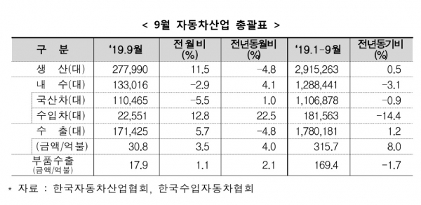 산업통상자원부는 지난 9월 국내 자동차 산업 실적을 분석한 결과 지난해 같은 달 대비 내수는 4.1% 증가했지만 생산은 4.8%, 수출은 4.8% 감소한 것으로 잠정 집계됐다고 17일 밝혔다.