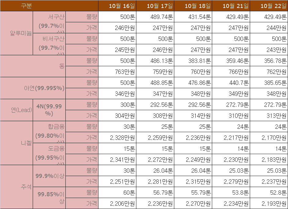 10월 22일 조달청 비철금속 비축물자 방출가격