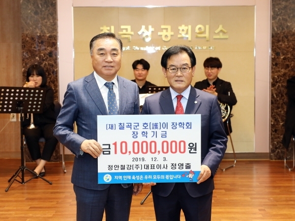 강관 제조업체 정안철강의 정영출 대표는 3일 '2019 칠곡군 상공인워크숍' 행사장에서 지역인재육성과 교육발전을 위해 호이장학금 1,000만원을 칠곡군호이장학회(이사장 백선기)에 기탁했다. 박재철 기자 parkjc@snmnews.com 다른 기사 보기 관련기사 정안철강, 성주공장 구조관 생산 확대 정안철강, 고강도 'S-ART 강관' 판매 확대 나서 정안철강, 단관비계용강관 수출로 품질 입증 정안철강, 성주공장 농원용강관 판매 확대 포항시, 지역 R&BD기관 협력체계 구축 위한 정책 간담회 개최 성훈테크 김득철 대표, 이웃돕기 성금 기탁 정안철강, 설비 자동화와 신제품 개발에 주력 저작권자 © 철강금속신문 무단전재 및 재배포 금지