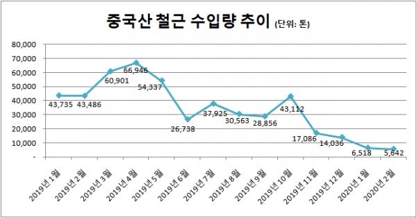 국내로 유입되는 중국산 철근 수입량이 더욱 줄어든 것으로 나타났다. 철강업계에 따르면 지난 2월 중국산 철근 수입량은 5,642톤 수준으로 전월 대비 15% 줄어들며 하락세를 이어갔다. 앞서 1월 중국산 철근 수입은 6,518톤을 기록하며 지난 2011년 9월 이후 약 8년 4개월 만에 가장 적은 수입량을 기록한 바 있다. 이에 중국산 철근 수입량은 최저 수준을 이어나가는 모습이다.