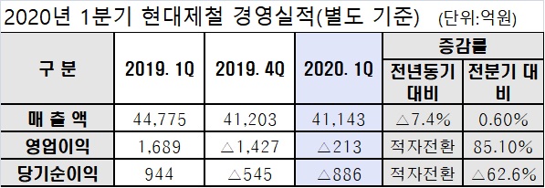 현대제철은 24일 컨퍼런스콜로 2020년 1분기 경영실적을 발표했다. 별도 기준 매출액 4조1,443억원, 영업손실 213억원, 당기순손실 886억원을 기록했다. 연결 기준으로는 매출액 4조6,680억원, 영업손실 297억원, 당기순손실 1,154억원을 기록했다.