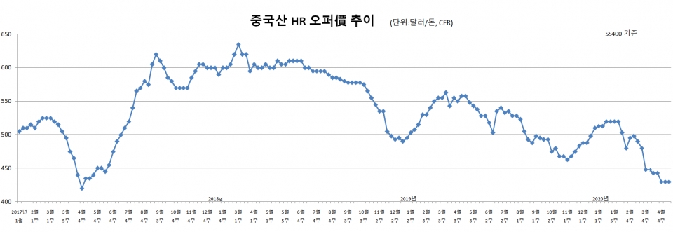 수입업계에 따르면 5월 첫째 주, 중국 HR 제조업계의 한국행 수출 오퍼가격은 톤당 430달러 수준(CFR)을 기록했다. FOB 거래 기준으로는 톤당 420달러 수준이다. 지난 4월 중순 이후, 3주 연속 보합 흐름을 나타내고 있다.