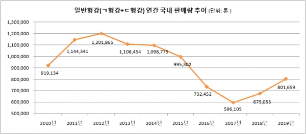 다만 2018년부터 일반형강 판매량은 늘어나는 모습을 나타내고 있으며, 지난 2019년 일반형강 판매는 80만톤을 넘기며 2016년 이후 가장 많은 판매량을 기록했다.