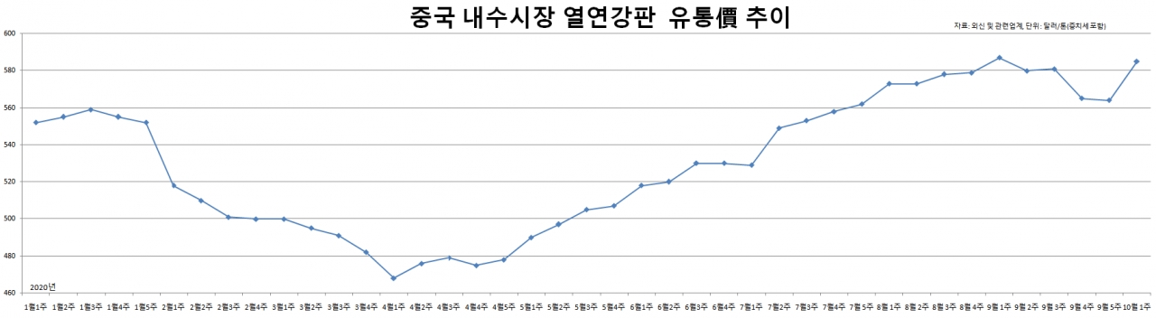 현지 철강시장 전문가들은 “9월 가격 하락세가 단기 조정으로 볼 수 있을지는 중순 장에서 확인해야 할 것”이라며 “미국과 유럽의 코로나19 확산세에도 거대 시장인 중국은 10월 재반등 가능성이 충분해 보인다”고 설명했다.