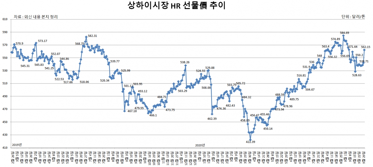 한국 수출가격과 내년 열연 시장을 가늠할 수 있는 선물가격도 급등했다. 첫째 주, 상하이선물거래소의 HR 선물가격은 톤당 562.15달러(9일/3,772위안)로 직전 마지막 거래일 대비 톤당 20달러 수준 상승했다.
