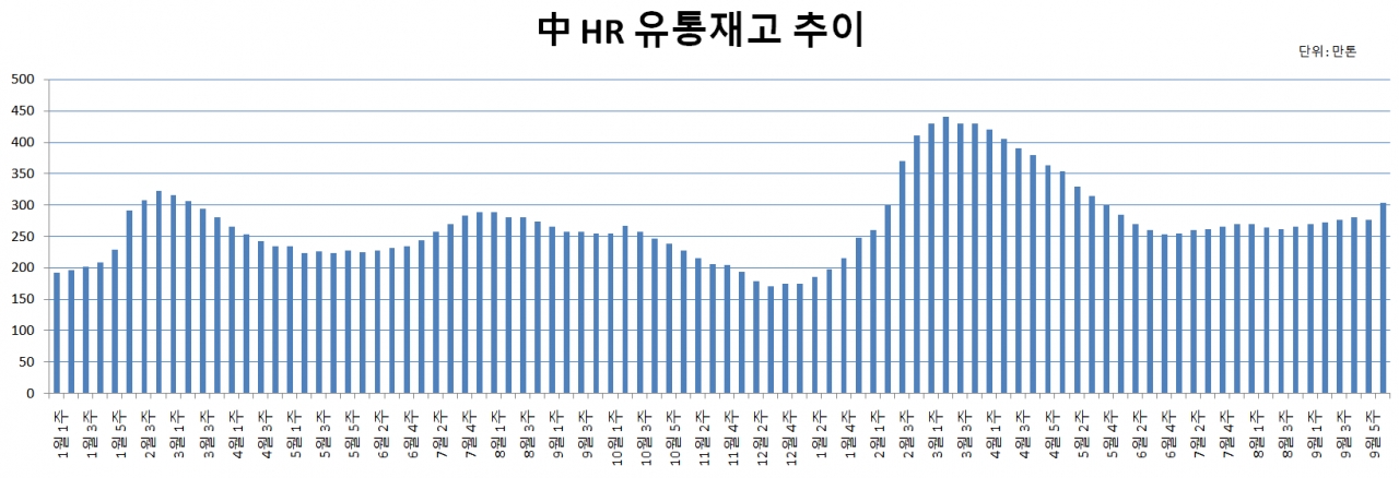 현지 HR 재고의 경우 첫째 주, 304만톤으로 증가세가 두드러졌다. 3개월 전보다 약 50만톤, 19% 증가했다. 동절기 감산 정책 시행을 앞두고 현지 고로 가동률이 80% 중반대 수준(표본 업체대상)까지 상승했기 때문이다.