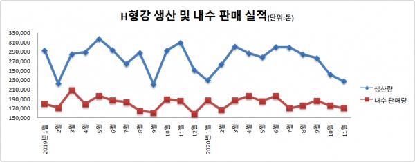 이에 올해 제품 생산과 판매는 전년 대비 소폭 줄어든 것으로 집계됐다. 올해 11월 누계 기준 국산 H형강 생산량은 299만4,399톤을 기록해 지난해 같은 기간 대비 2.9% 줄었으며, 내수 판매는 200만1,804톤으로 전년 동기 대비 0.4% 감소했다.
