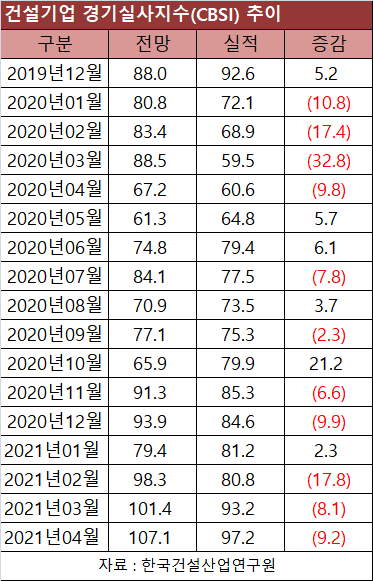 건산연이 최근 발표한 자료 따르면 4월 CBSI는 전월 대비 4p 상승한 97.2를 나타냈다. 이에 CBSI는 지난 3월 93.2를 기록해 2015년 7월 101.3을 기록한 이후 5년 8개월 만에 최대치를 기록했으며, 4월 97.2를 나타내 2015년 7월 이후 가장 높은 수준을 유지했다.