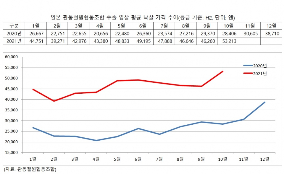 관동철원조합의 철스크랩 수출 입찰에서 10월 낙찰 가격은 H2 기준 톤당 5만3,213엔(FAS 기준)으로 전월인 9월의 4만6,260엔 대비 6,953엔이 올랐다. 앞선 달인 9월에는 전월 대비 386엔이 떨어졌다. 관동철원의 낙찰 가격은 8월에도 1,242엔이 하락한 바 있다.