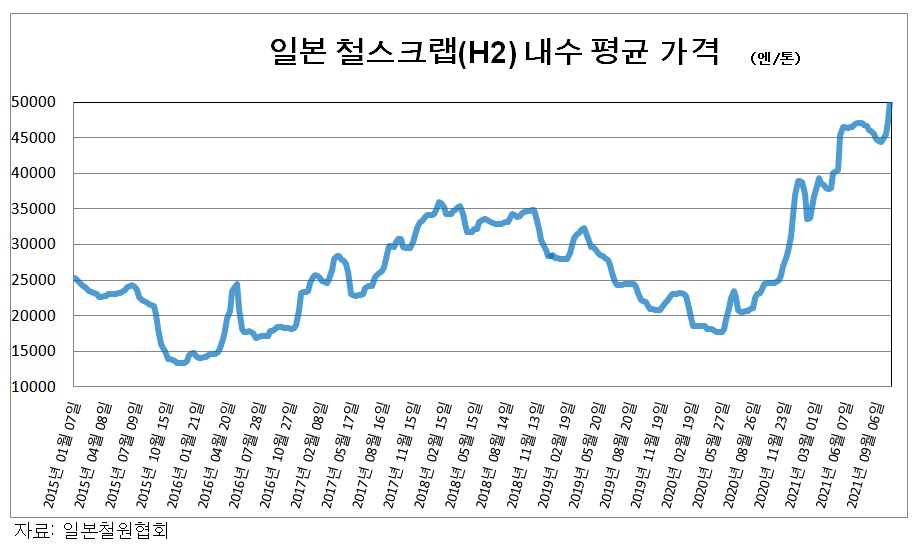 일본철원협회의 주간 가격 조사에 따르면 10월 둘째 주 일본 H2 철스크랩의 평균 거래 가격은 톤당 5만293엔으로, 4만7,348엔이었던 전주 대비 톤당 2,945엔이 상승했다. 앞선 주에도 톤당 1,805엔이 상승한 바 있다. 4주간 상승 폭은 톤당 5,959엔이다. 톤당 5만293엔은 2008년 8월 3주 차에 기록했던 5만1,936엔 이후 13년 4개월 만에 최고치로 기록됐다. 일본 철스크랩 가격 상승세가 본격화한 모습이다.