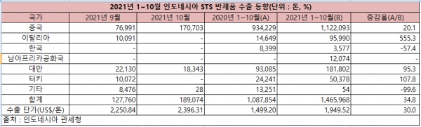 한편 인도네시아의 최대 STS 수출국인 중국이 내년 1분기 말까지 강력한 환경 규제를 실시할 예정인 데다 주요국들이 동계기간 비수기에 진입하면서 수요가 감소하고 있어 12월 이후 STS 수출은 감소할 것으로 예상된다.