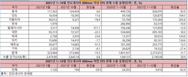 주요국들의 백신 접종 확대와 세계 경제 회복, 코로나19 기저효과 등으로 인해 인도네시아의 STS 반제품 및 판재류 수출이 증가한 것으로 나타났다. 그리고 니켈과 크로뮴 등 주요 원료 가격 강세가 지속되면서 수출 단가도 큰 폭으로 상승했다.