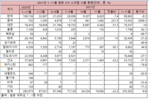 일본 재무성 발표에 따르면 2021년 11월 일본의 STS 스크랩 수출은 1만9,082톤으로 전월 대비 22.2% 감소했다.