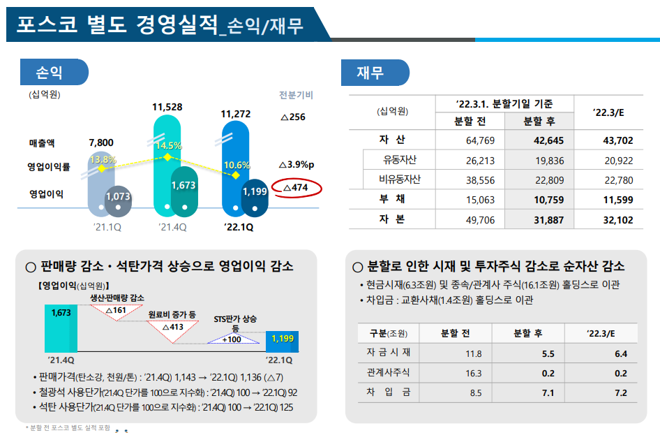 회사의 별도기준 1분기 매출액은 11조2,720억원으로 직전대비 2,560억 감소했다. 직전대비 실제 감소율은 2.2%인 반면 전년동기대비 44.5% 늘어난 것으로 나타났다.