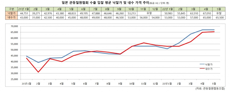 5월 일본 관동철원협회 철스크랩 수출 입찰이 결국 유찰됐다. 글로벌 철스크랩 가격이 연일 급락하는 가운데 일본 내수 가격은 견조해 무산된 것으로 풀이된다.