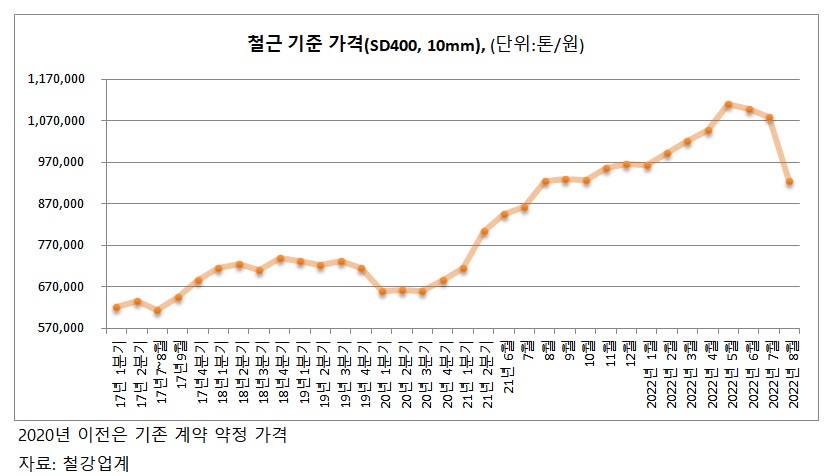 8월 철근 기준 가격이 톤당 15만4천원이 내려가면서 3개월 연속 인하됐다.