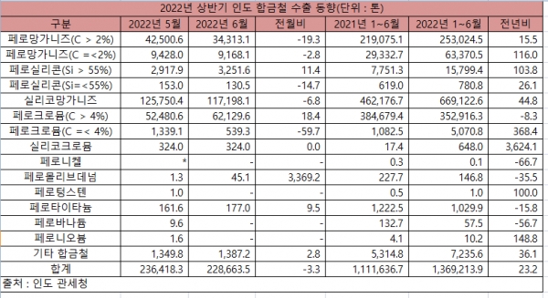 6월 수출은 감소했지만 주요국들의 경기부양책으로 전반적 철강 수요가 증가한 가운데 러시아-우크라이나 전쟁 여파에 따른 러시아산 수출 제재로 세계 시장의 공급이 부족해지면서 상반기 인도의 합금철 수출은 전년 동기 대비 23.2% 증가한 136만9,213.9톤을 기록했다. 특히, 실리콘과 망가니즈 계열 합금철 수출이 큰 폭으로 증가했다.