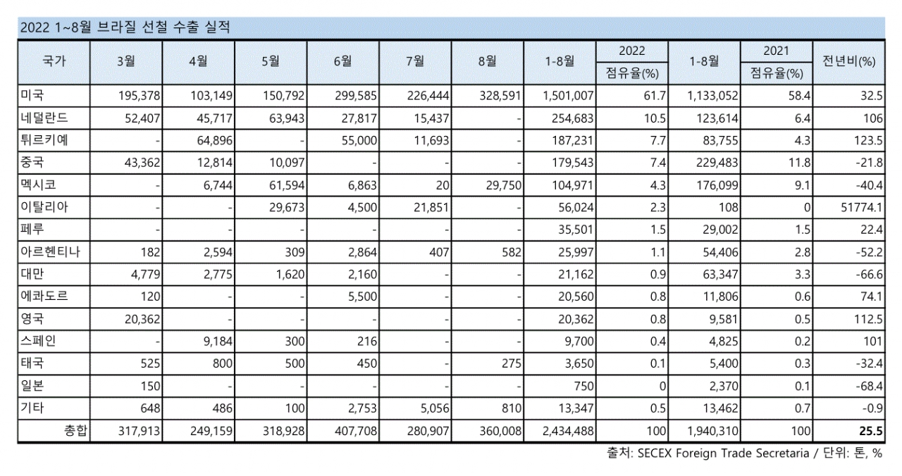 이어 네달란드향 수출은 106.0% 급증한 25만5,000톤을 기록하며 점유율도 두 자릿수로 오른 모습이다. 튀르키예향 수출 역시 18만7,000톤을 기록해 123.5% 크게 늘어나며 두 배 이상 증가했다.