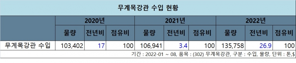 한국철강협회에 따르면 1~8월까지 무계목강관의 수입은 총 13만5,758톤으로 지난해 같은 기간 10만6,941톤 보다 26.9% 증가했다. 지난 2020년의 경우 10만3,402톤을 기록했다. 2년 연속 10만톤 초반대에 머물던 무계목강관의 수입이 13만톤까지 증가한 셈이다.