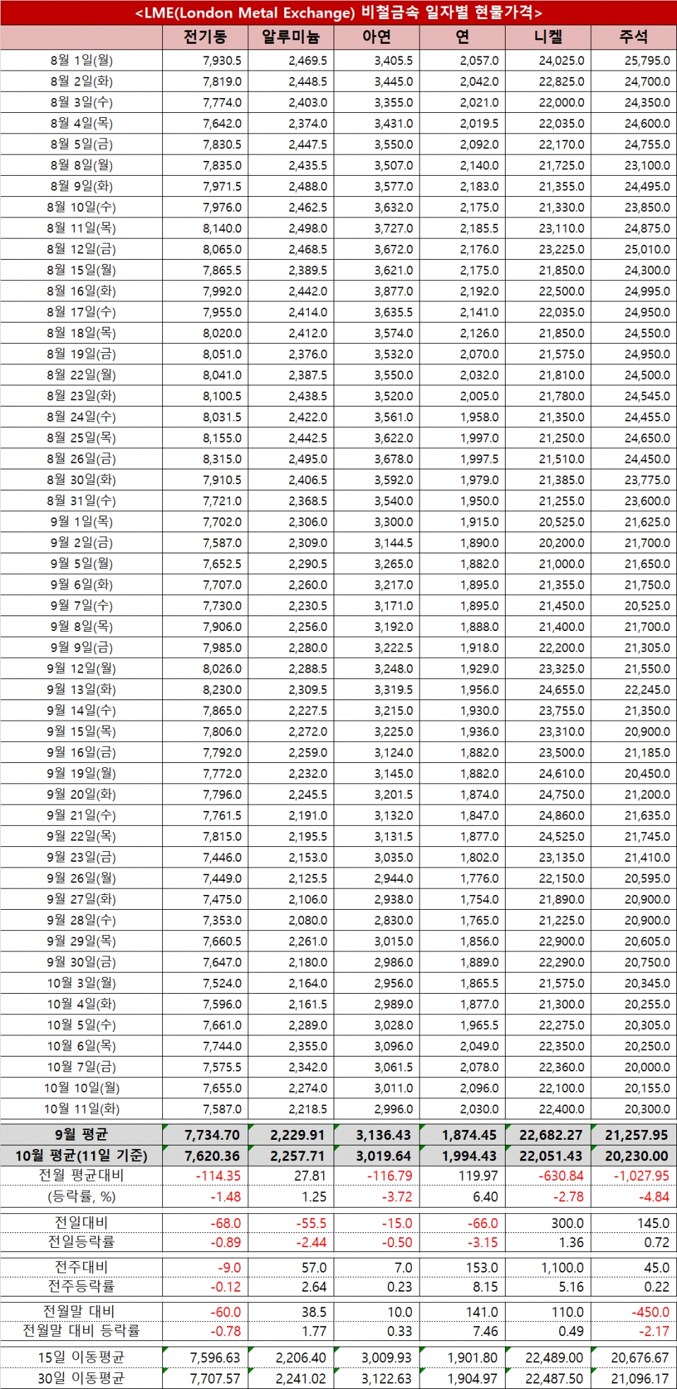 지난 11일 런던금속거래소(LME)에서 거래된 비철금속 현물 오피셜 가격은 전기동이 톤당 7,587달러(-68), 알루미늄 2,218.5달러(-55.5), 아연 2,996달러(-15), 연 2,030달러(-66), 니켈 2만2,400달러(+300), 주석 2만300달러(+145)를 각각 기록했다.