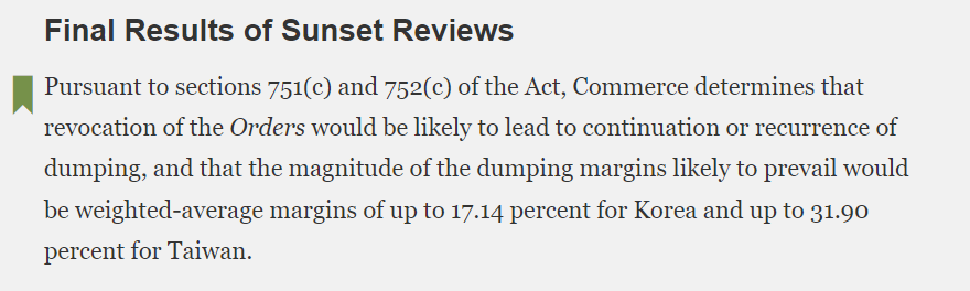 미 상무부는 “이번 조사 대상인 한국과 대만산 크로뮴-니켈계 스테인리스 용접강관은 기존 반덤핑 제재가 해제되면 미국 동종 산업에 덤핑 피해를 줄 것으로 판단된다”라고 설명했다. 해당 5년 단위 일몰 재심은 지난 1992년부터 시작되어 올해로 20년째 유지되고 있다.