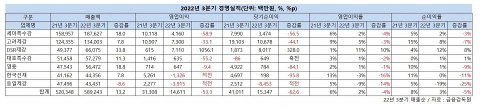 올해 선재 제품 제조업체들의 3분기(별도 기준) 영업이익과 순이익이 모두 급감했다. 매출은 소폭 늘었으나 대부분 원자재 가격 상승에 따른 매출 원가 증가로 실적 고전을 면치 못했다.