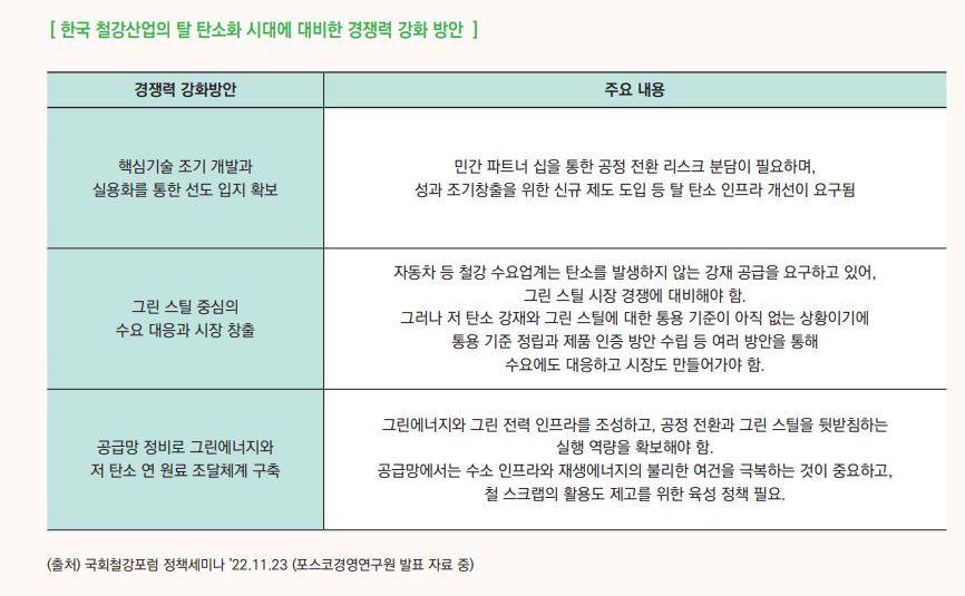 현재 탈탄소화 시대에 대응한 국내 철강산업의 경쟁력 강화방안으로 그린 생산공정에서의 핵심기술 조기 개발, 그린스틸의 적극적인 수요 대응, 공급망 정비 차원에서의 그린에너지와 저탄소연 연로 조달 안정화 등이 제안되고 있다.