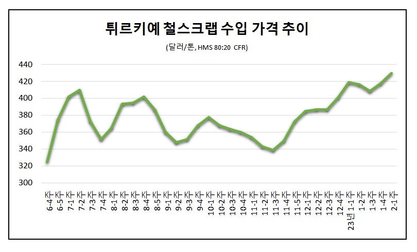 신규 거래가 없는 점을 고려해 지난 6일 기준 튀르키예 철스크랩 수입 가격은 HMS(80:20) 기준 톤당 430달러(CFR)로 전주 말 대비 보합을 나타냈다.