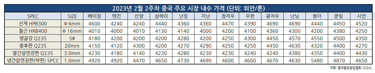 2월 2주차 중국 내수 시장 가격이 소폭 하락했다.