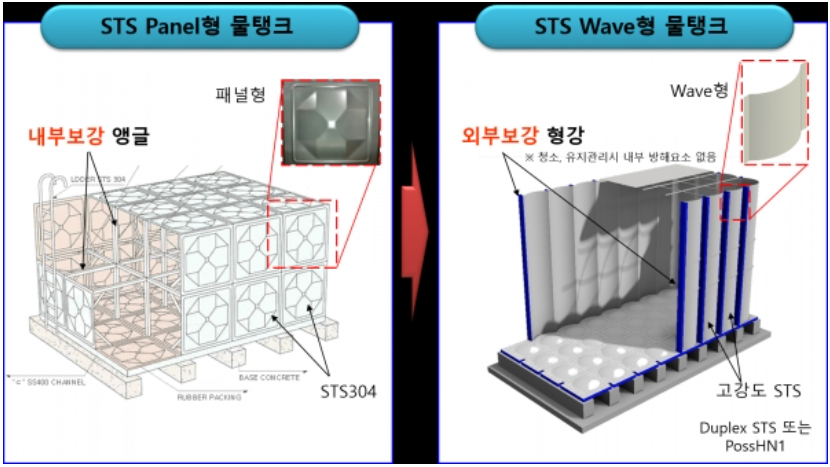 이에 대해 철강협회 스테인리스스틸클럽에서는 스테인리스 웨이브형 물탱크 설치를 적극 권장하고 있다. 스테인리스스틸클럽은 포스코 철강솔루션연구소 등 국내 철강업계와 스테인리스 웨이브형 물탱크 시공 방법을 개발하고 우수한 내진 성능을 대외에 공개한 바 있다.