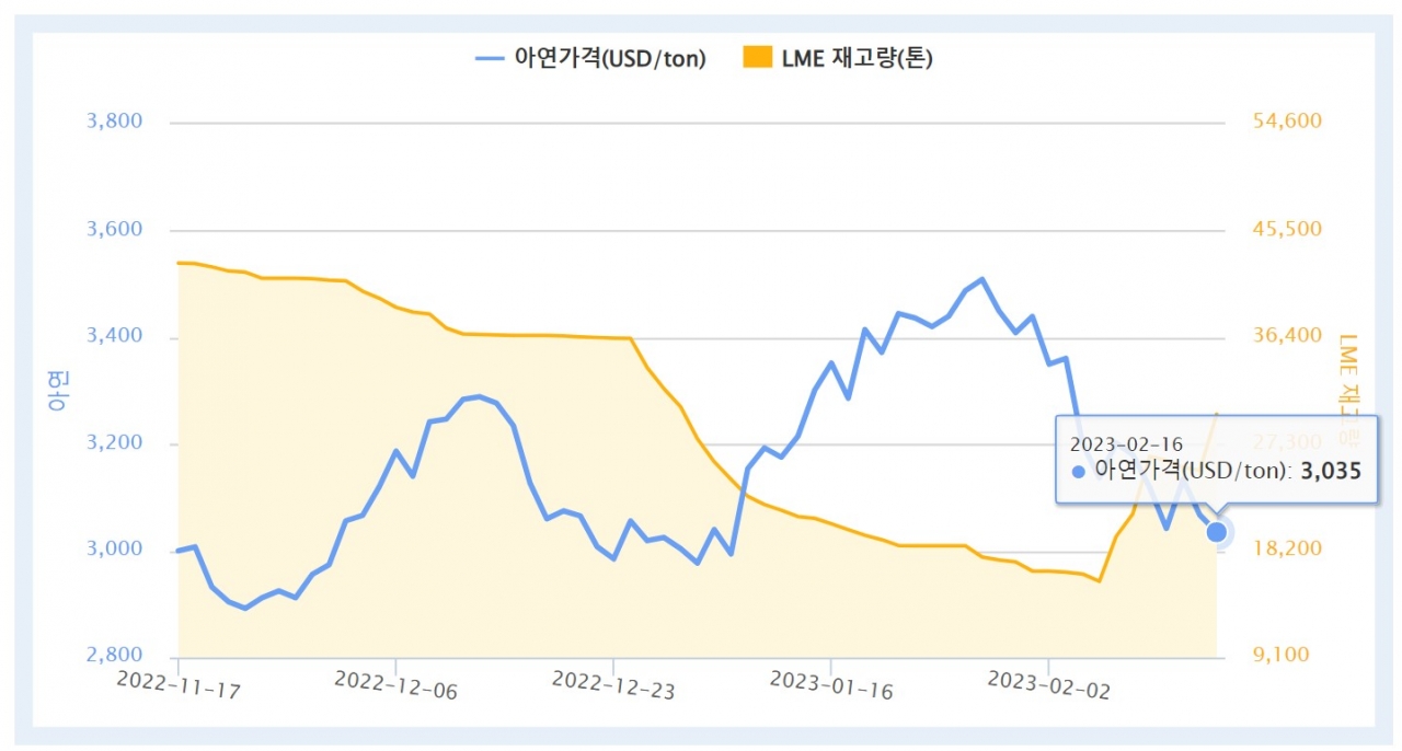 지난 1월 미국의 생산자물가지수(PPI)가 7개월 최고치를 기록했다. 앞서 발표된 소비자물가지수(CPI)가 시장 전망치보다 높게 나타났고, 물가지수 상승률이 모두 높게 발표되면서 인플레이션에 대한 우려로 반영되며 달러 인덱스 상승했고 이로 인해 비철금속 등 주요 원자재 가격에 하방압력을 가했다. 이후 미 달러가 다시 약세를 보이면서 LME 아연 가격은 랠리를 펼친 전일 마감 대비 소폭 상승한 채 거래를 마쳤다.