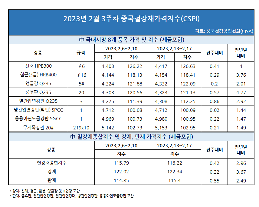관련기사 CISA, 2월 4주차 중국 내수 가격 발표 CISA, 2월 3주차 중국 내수 가격 발표 (주간시장동향-컬러강판) 중국산 수입 감소 CATL, '반값 리튬'으로 배터리 독점 공급 협상 [일일Al가격] FOMC 의사록 공개.. 알루미늄 가격 약세로 (특수강) 수입시장 기류 변화...중국산 저가 물량 증가세 [표] 2023년 2월 4주차 중국철강재가격지수(CSPI) "씨에스윈드, 제품 가격 인상으로 실적 개선" [표] 2023년 3월 3주차 중국철강재가격지수(CSPI) [표] 2023년 3월 5주차 중국철강재가격지수(CSPI)